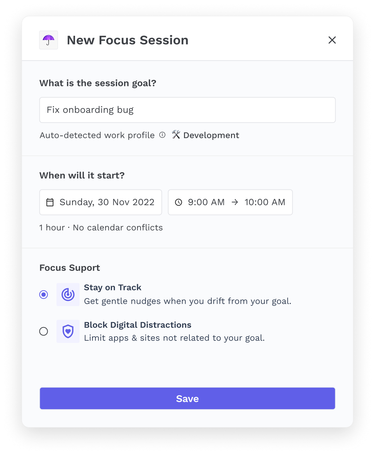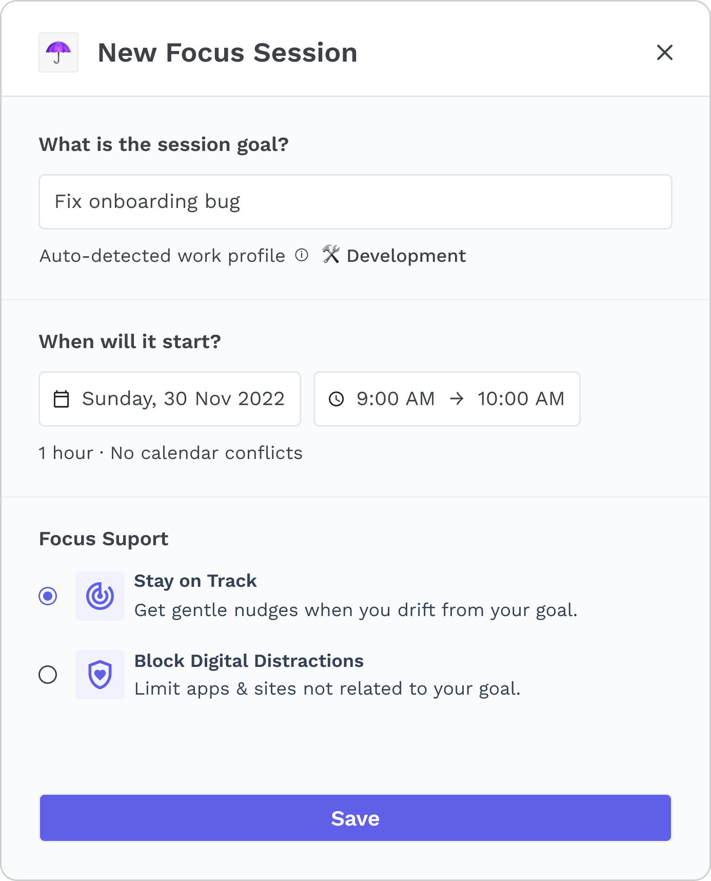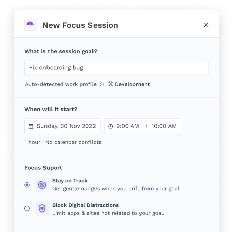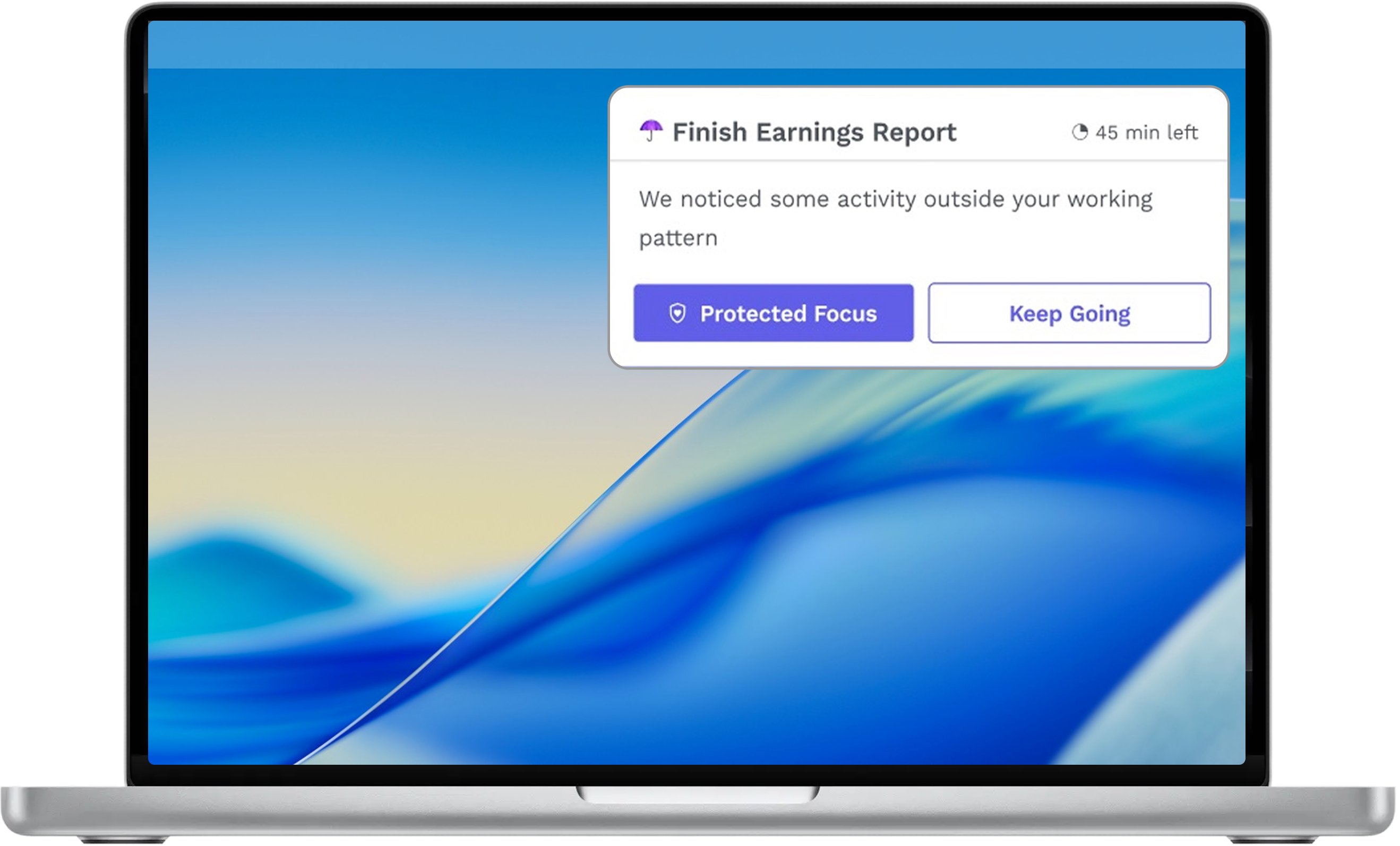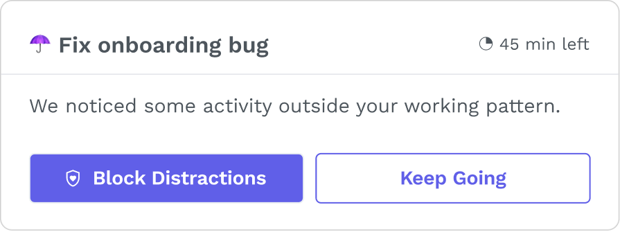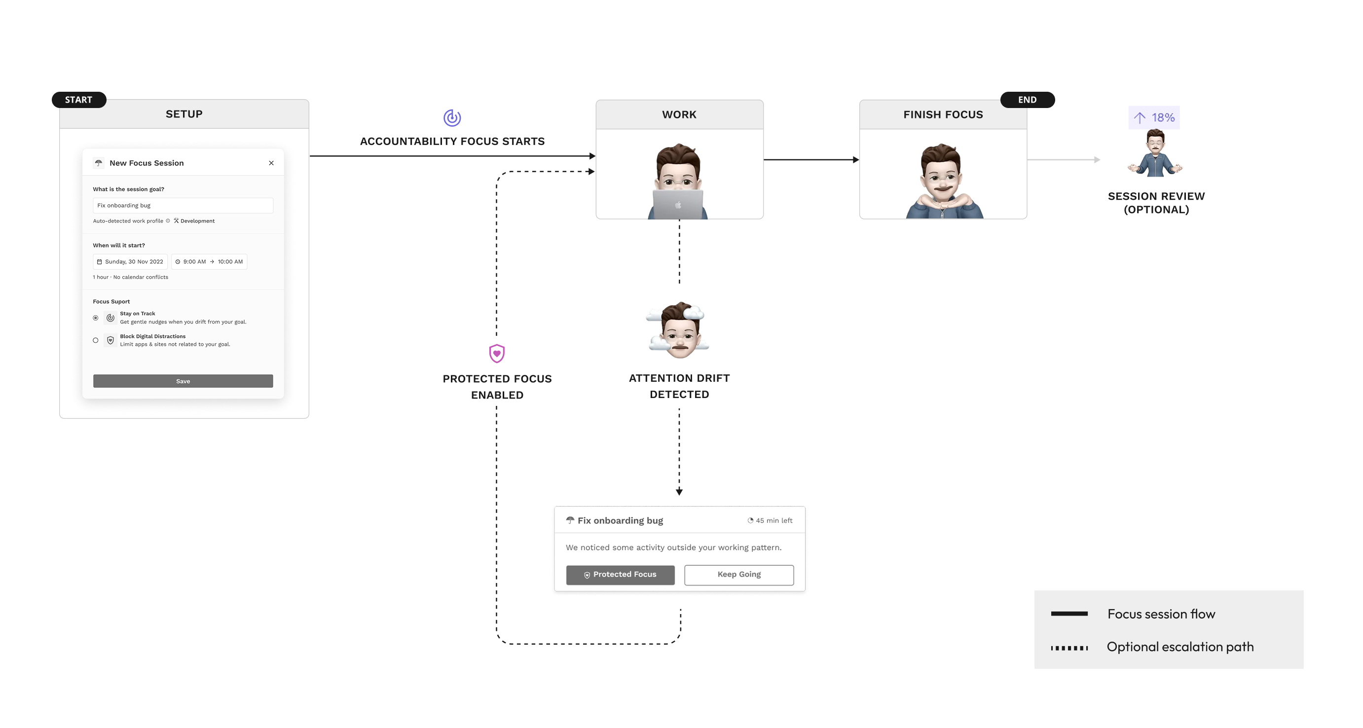 When a user starts a focus session, they select a work profile that defines expected behaviour. If activity consistently falls outside the expected pattern, it flags this as attention drift and triggers a notification. Over time, the model adapts, learning what focused work looks like for each user and task type.