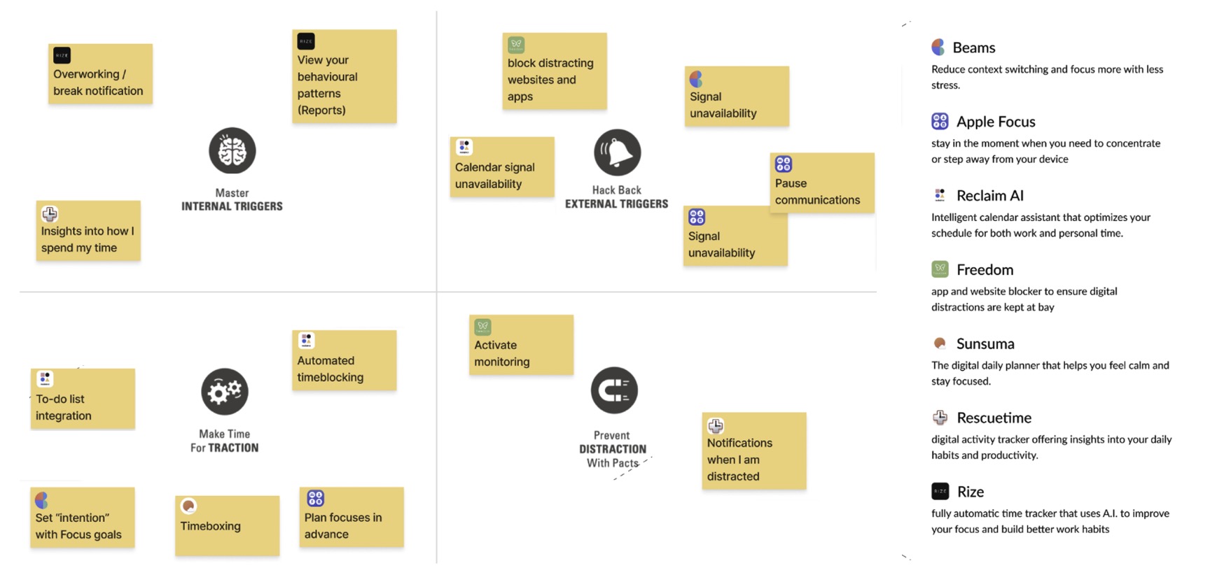 I analysed Focus Mode using Nir Eyal’s Indistractable model — a framework that outlines 4 complementary strategies for managing distraction. Through this lens, it was clear that Beams’ product addressed only a narrow slice of the focus problem: it subdued some external triggers but overlooked the deeper internal drivers and barriers to focus. In parallel, a hands-on review of the experience revealed conceptual flaws and UX limitations that reduced its practical value. My hypothesis? Users weren’t rejecting the idea of Focus Mode, but rather its narrow scope and limited execution.